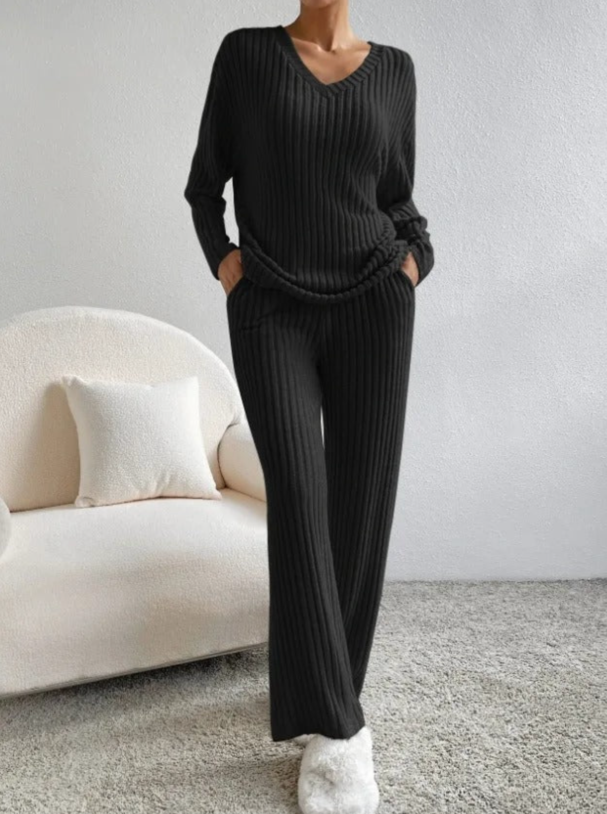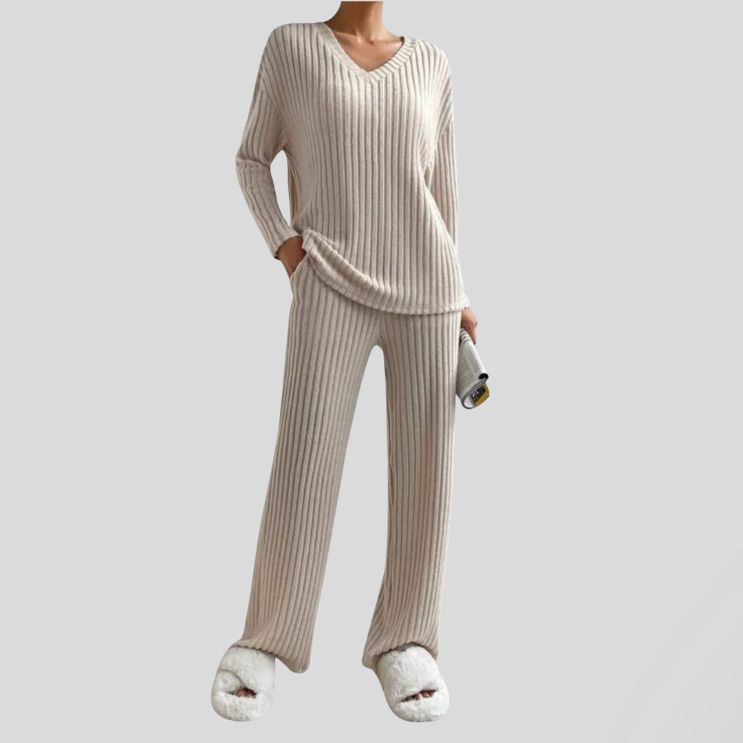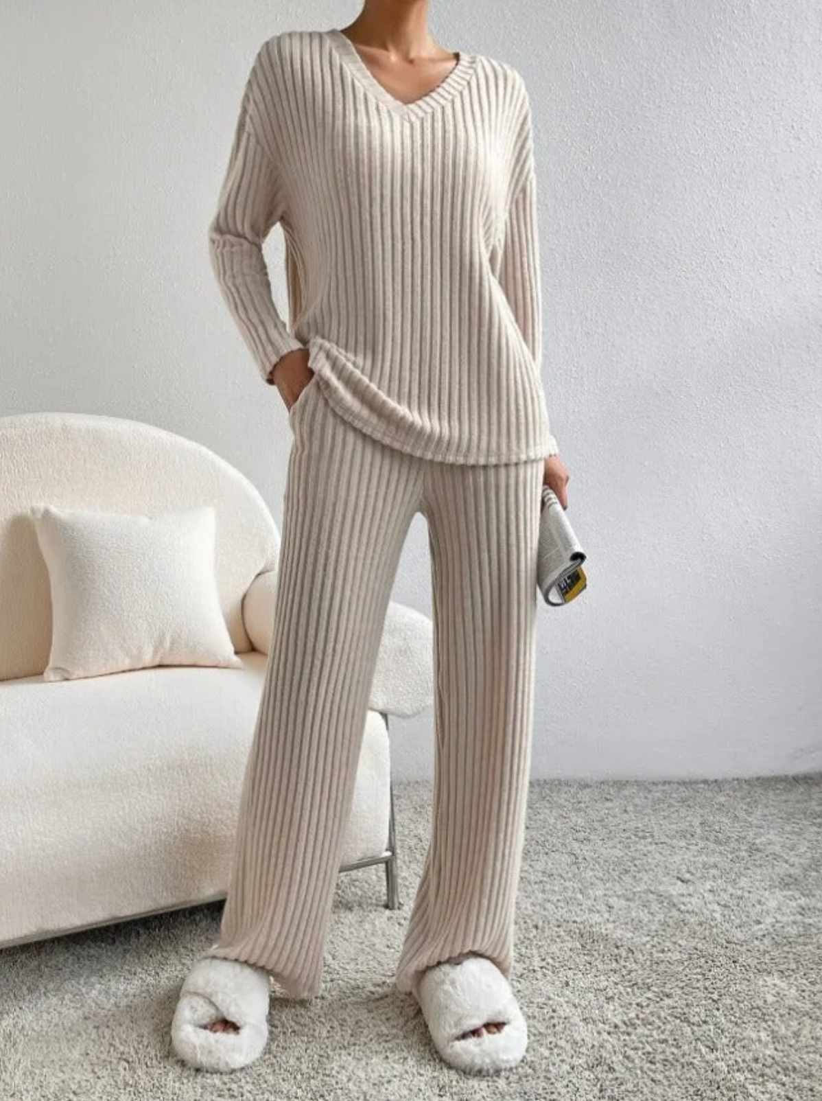 Il set è composto da un maglione con elegante scollo a V e da un paio di pantaloni coordinati dalla vestibilità comoda e flessibile. Crea un look elegante ma rilassato con il set da salotto Alice, ideale per chi desidera stile e comfort in un unico prodotto.