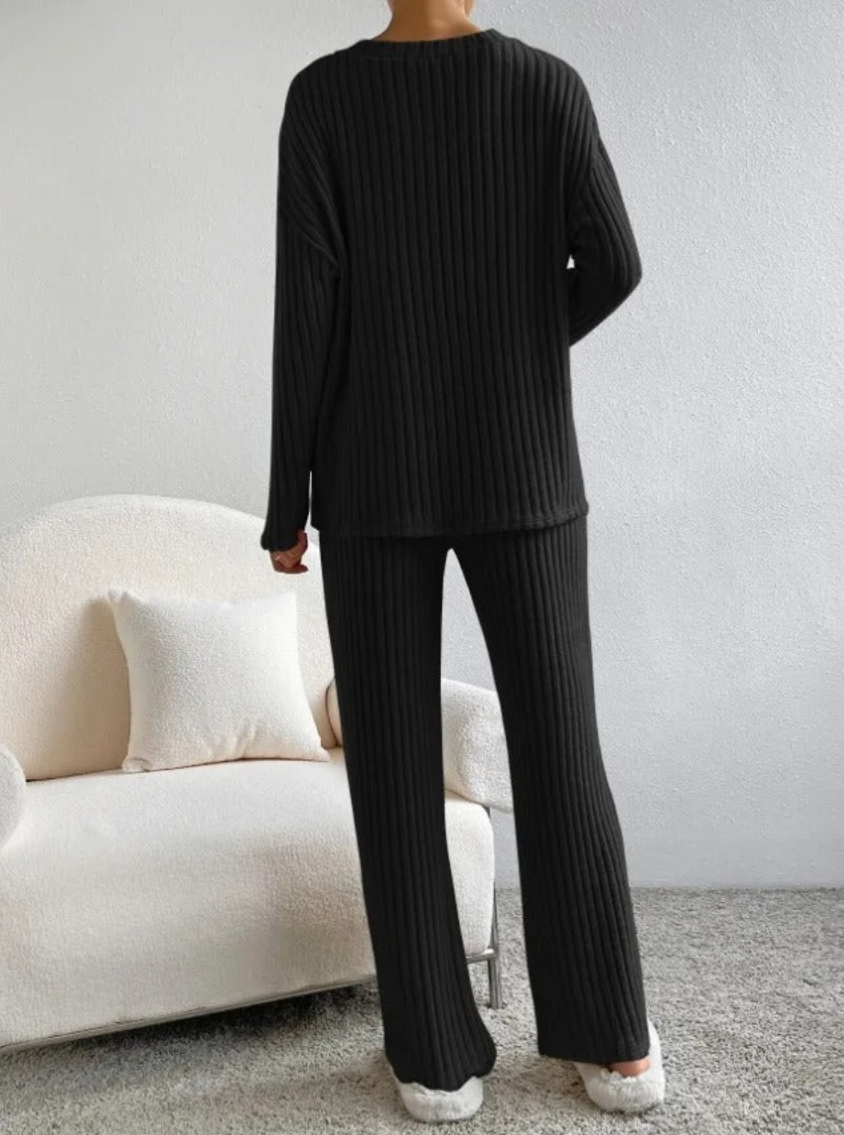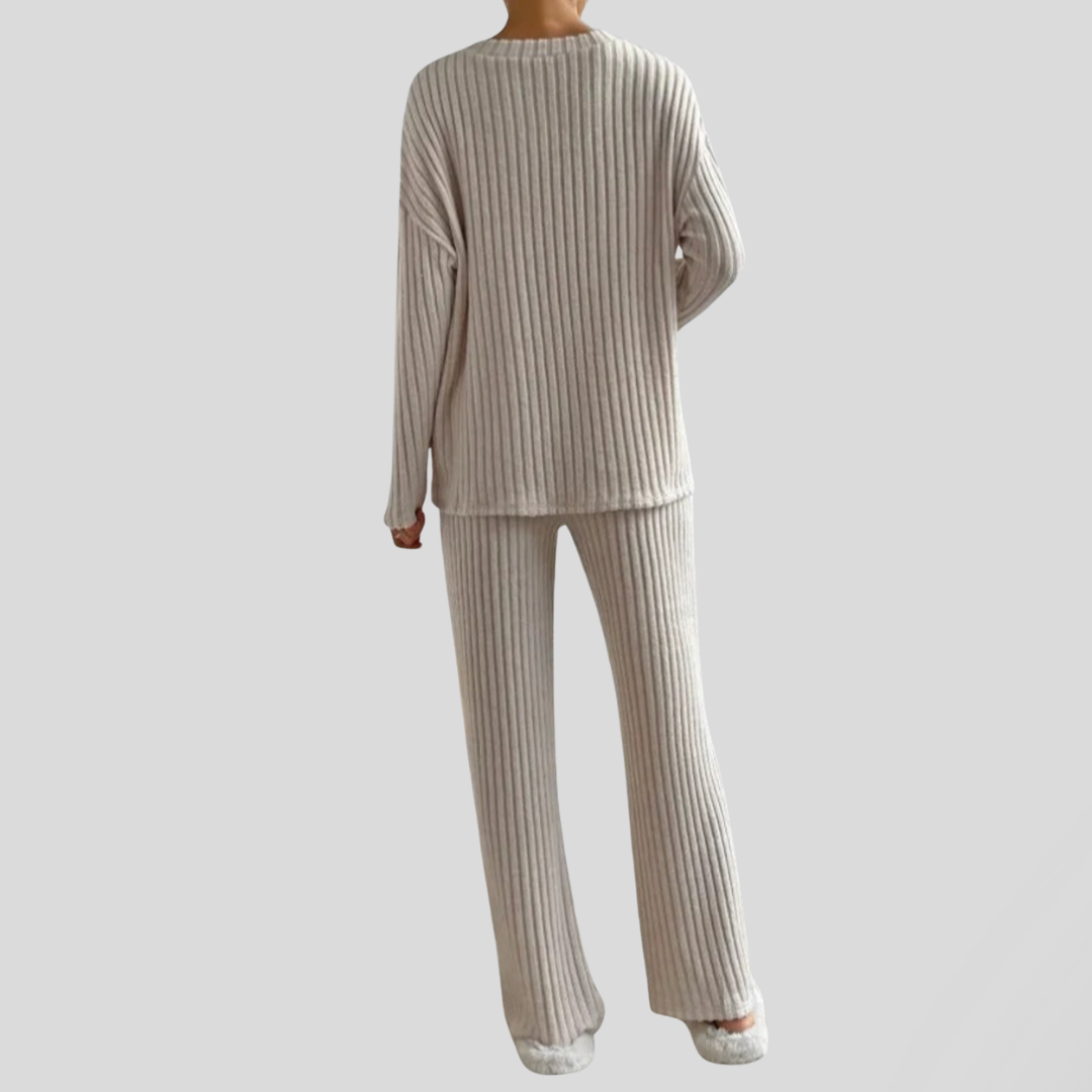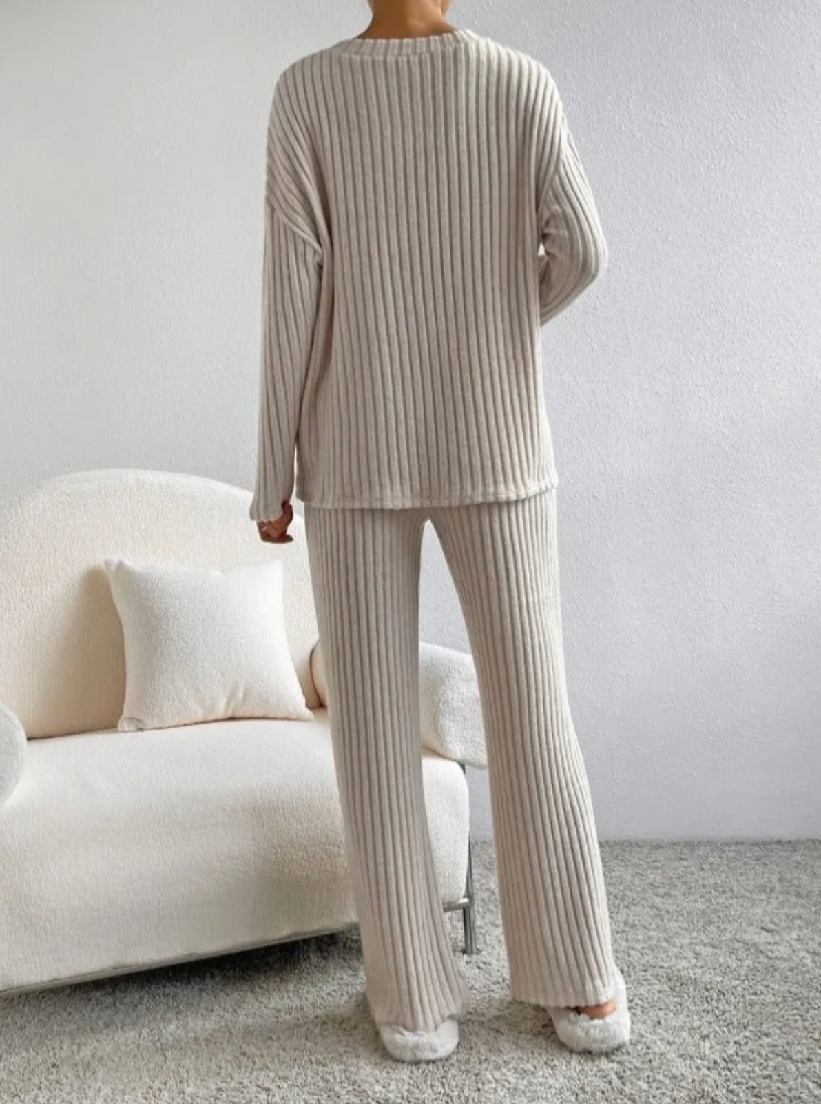 Il set è composto da un maglione con elegante scollo a V e da un paio di pantaloni coordinati dalla vestibilità comoda e flessibile. Crea un look elegante ma rilassato con il set da salotto Alice, ideale per chi desidera stile e comfort in un unico prodotto.