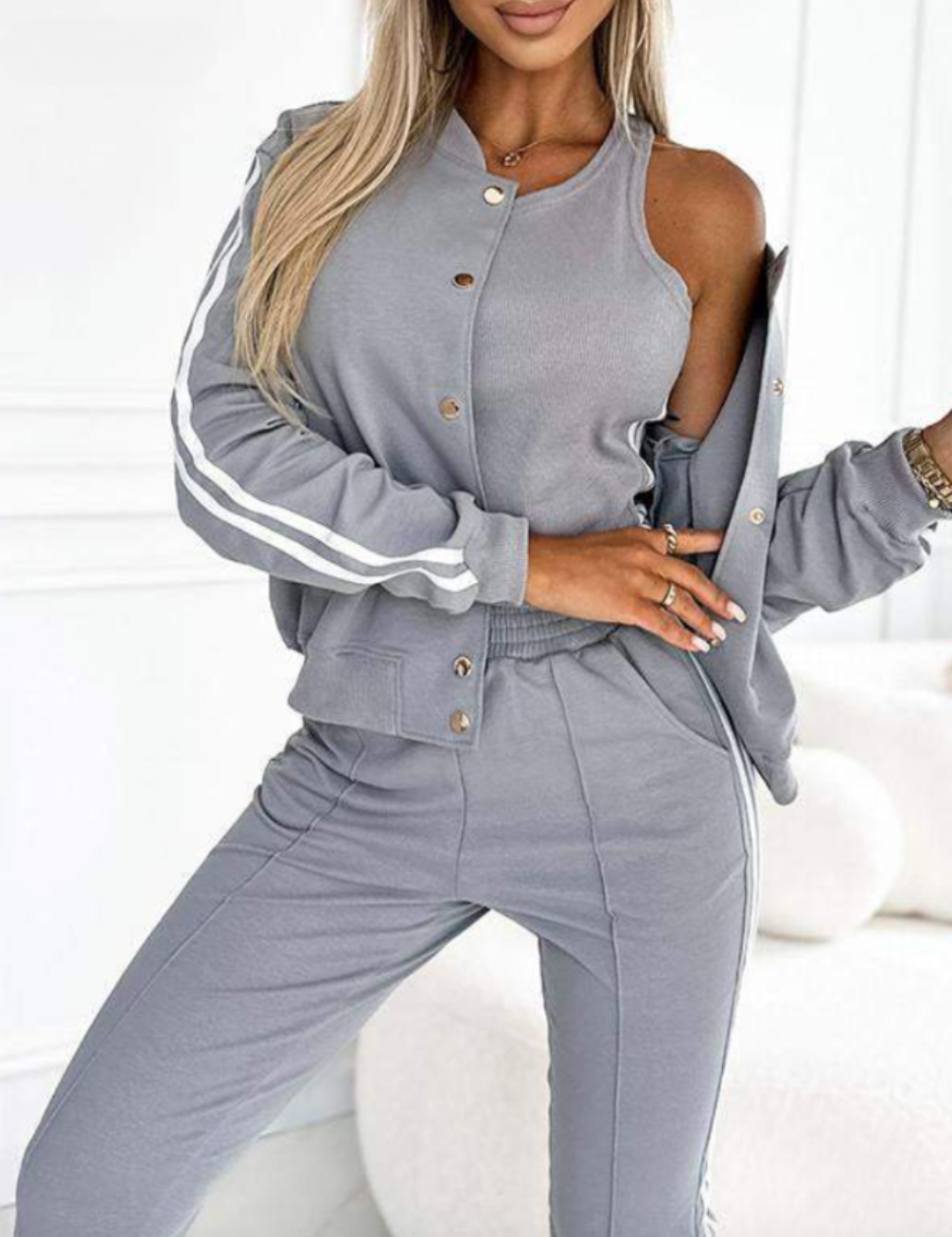 Cerchi vestiti che siano allo stesso tempo eleganti e incredibilmente comodi? Lo Stylish Comfort Set è la scelta perfetta per chi desidera un look moderno senza rinunciare alla comodità. Questo set da tre pezzi, composto da una giacca da baseball alla moda, un top attillato e un completo da jogging abbinato, ti regala un look moderno, mentre il tessuto morbido ed elasticizzato ti mantiene comodo per tutto il giorno.