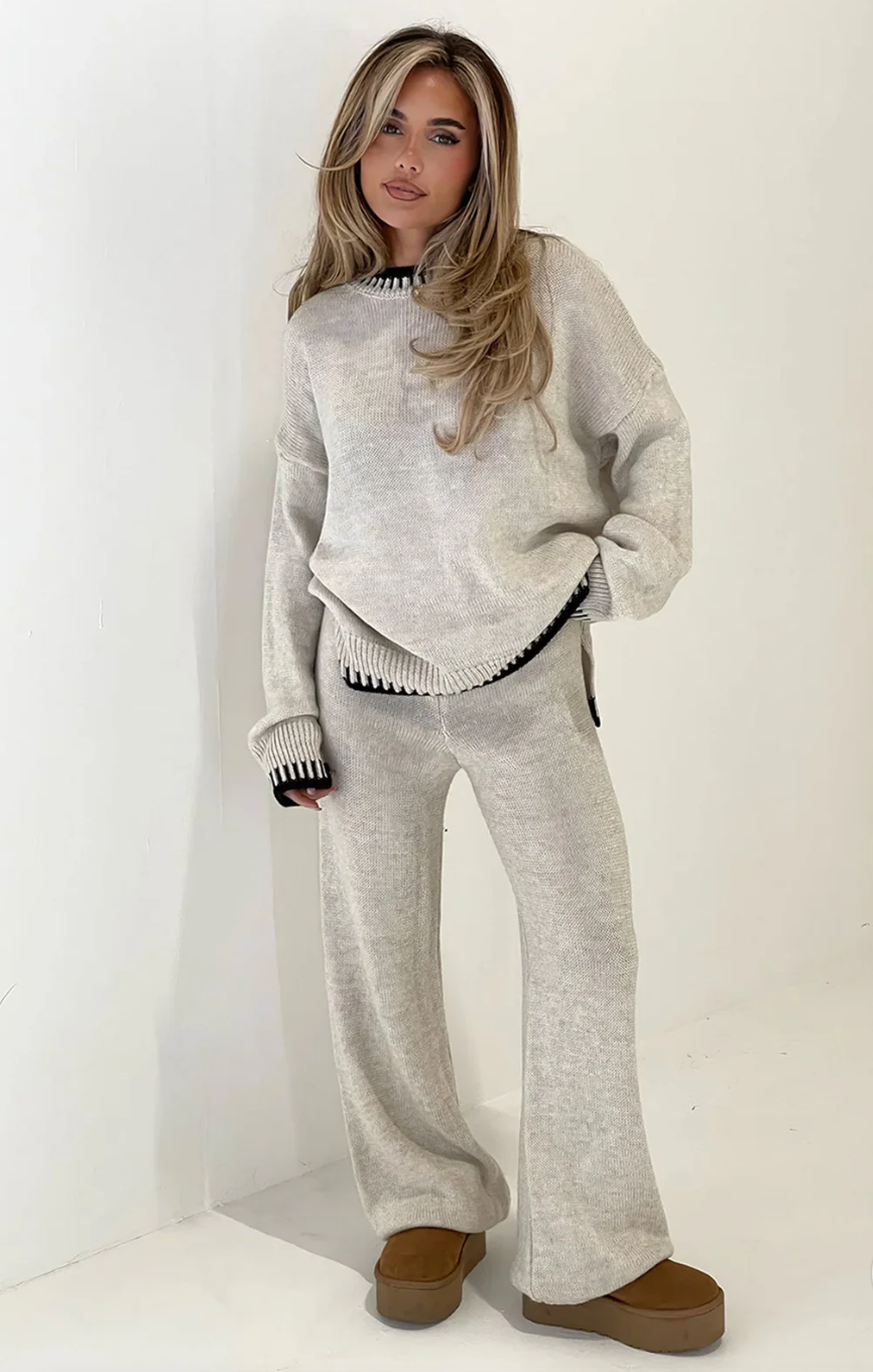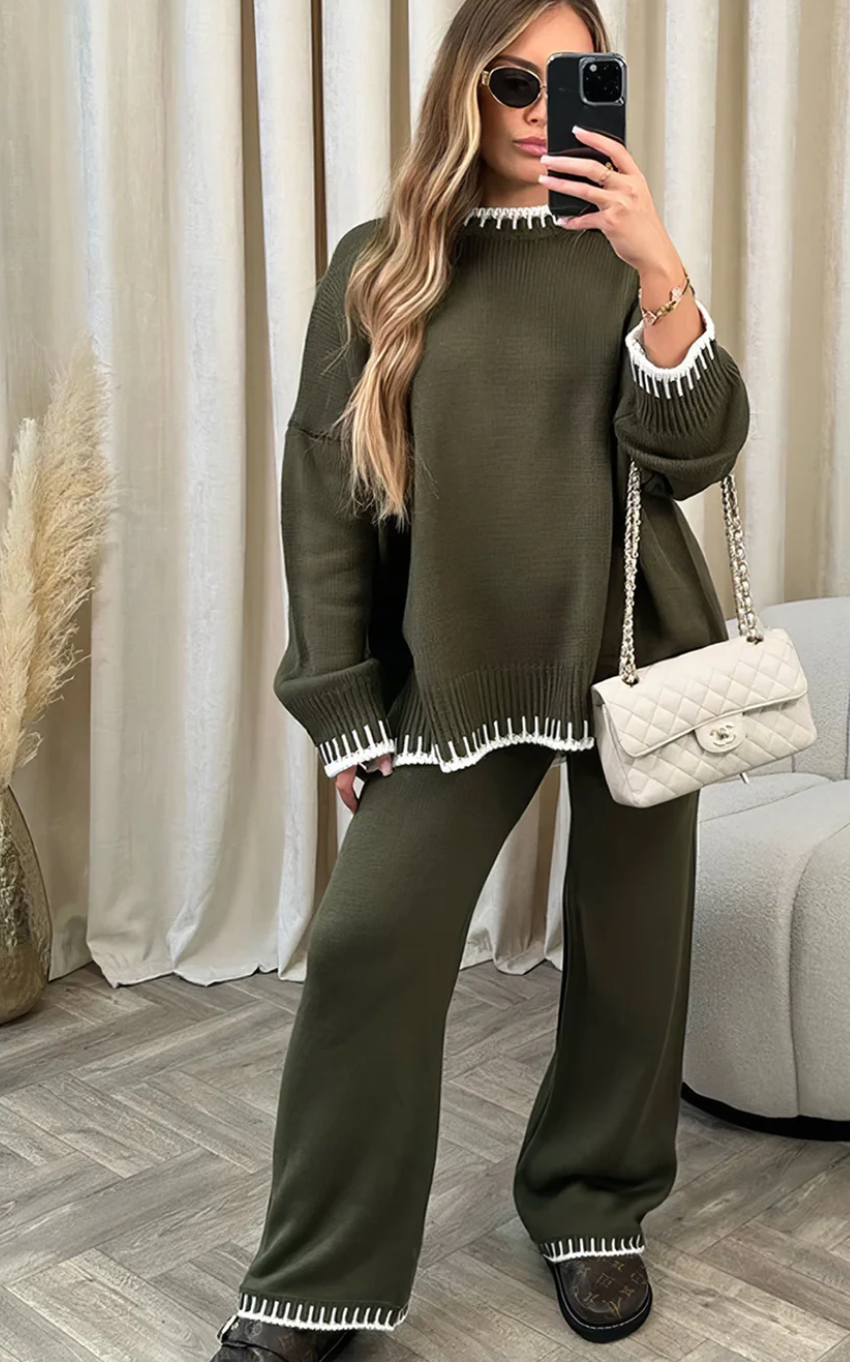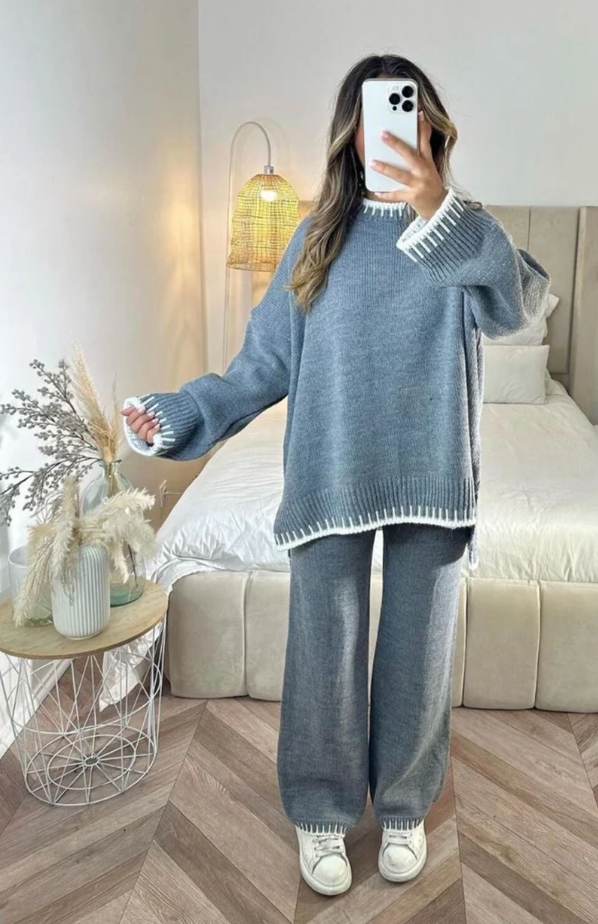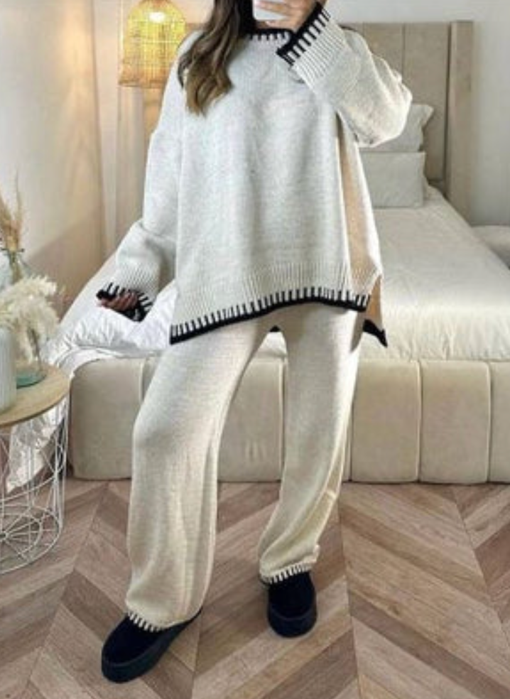 Lela è la scelta perfetta per un inverno caldo! Mantieniti elegante e comodo mentre ti godi le giornate fredde ma accoglienti. Il set è composto da un caldo top lavorato a maglia e da un paio di pantaloni lunghi, che puoi abbinare facilmente ai tuoi Ugg o alle tue sneaker preferite per un look casual e alla moda. Che tu ti stia rilassando a casa o che tu stia per partire per un viaggio invernale, questo è l'outfit che fa per te!