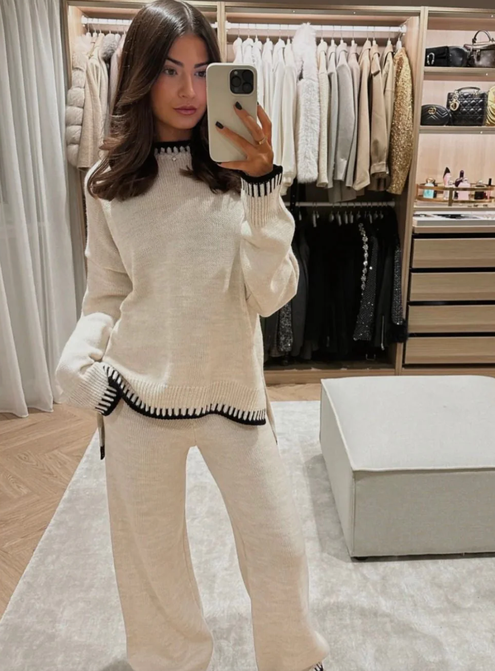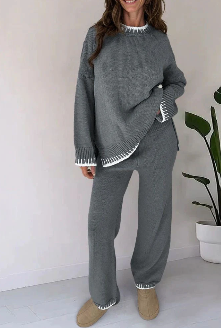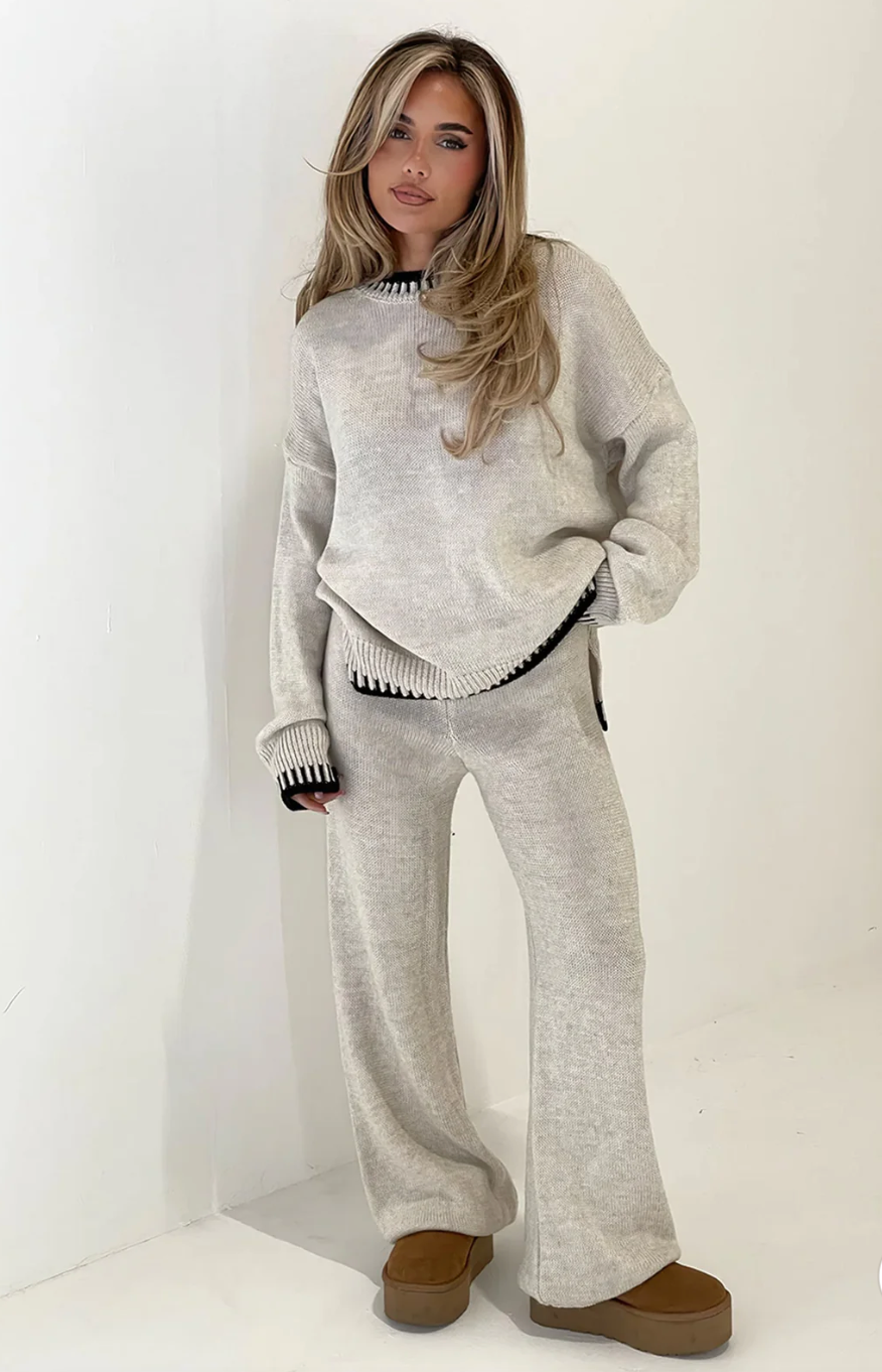 Lela è la scelta perfetta per un inverno caldo! Mantieniti elegante e comodo mentre ti godi le giornate fredde ma accoglienti. Il set è composto da un caldo top lavorato a maglia e da un paio di pantaloni lunghi, che puoi abbinare facilmente ai tuoi Ugg o alle tue sneaker preferite per un look casual e alla moda. Che tu ti stia rilassando a casa o che tu stia per partire per un viaggio invernale, questo è l'outfit che fa per te!